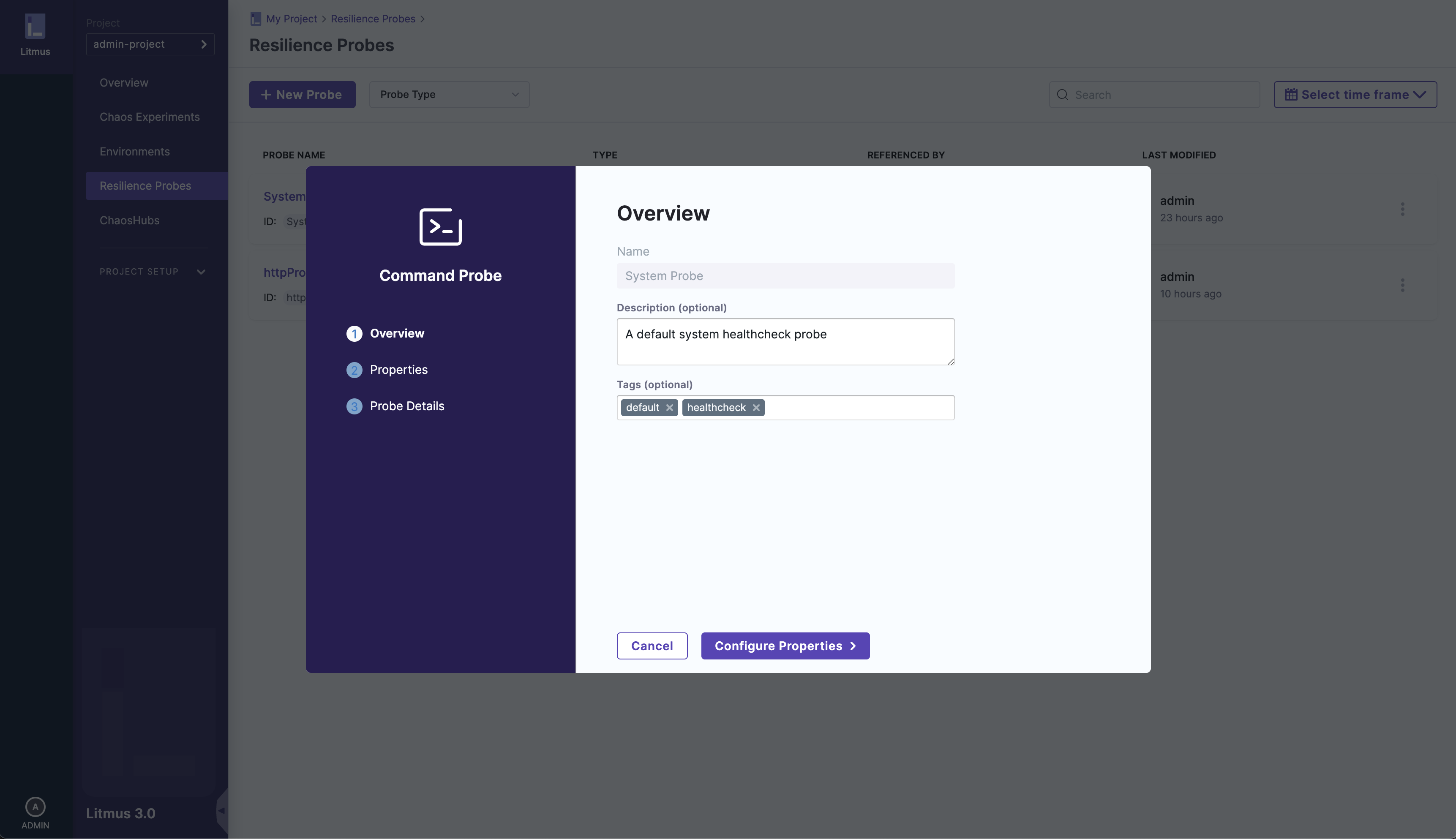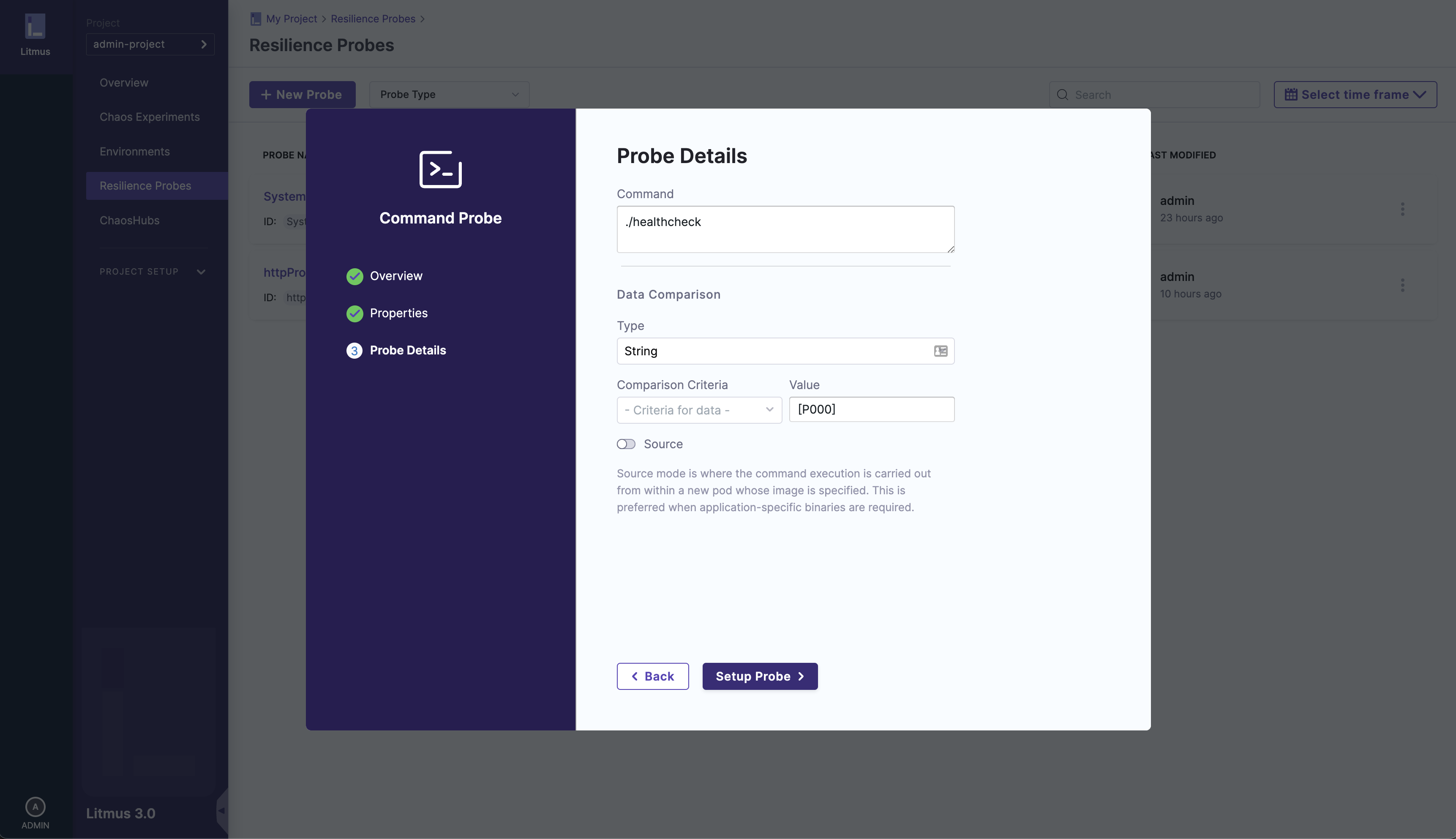 After opening the options menu and clicking on the Edit Probe option, you'll see a modal pop-up where you will be able to go through all the steps of probe setup and edit the details on each step (Note: name is unique and cannot be edited):